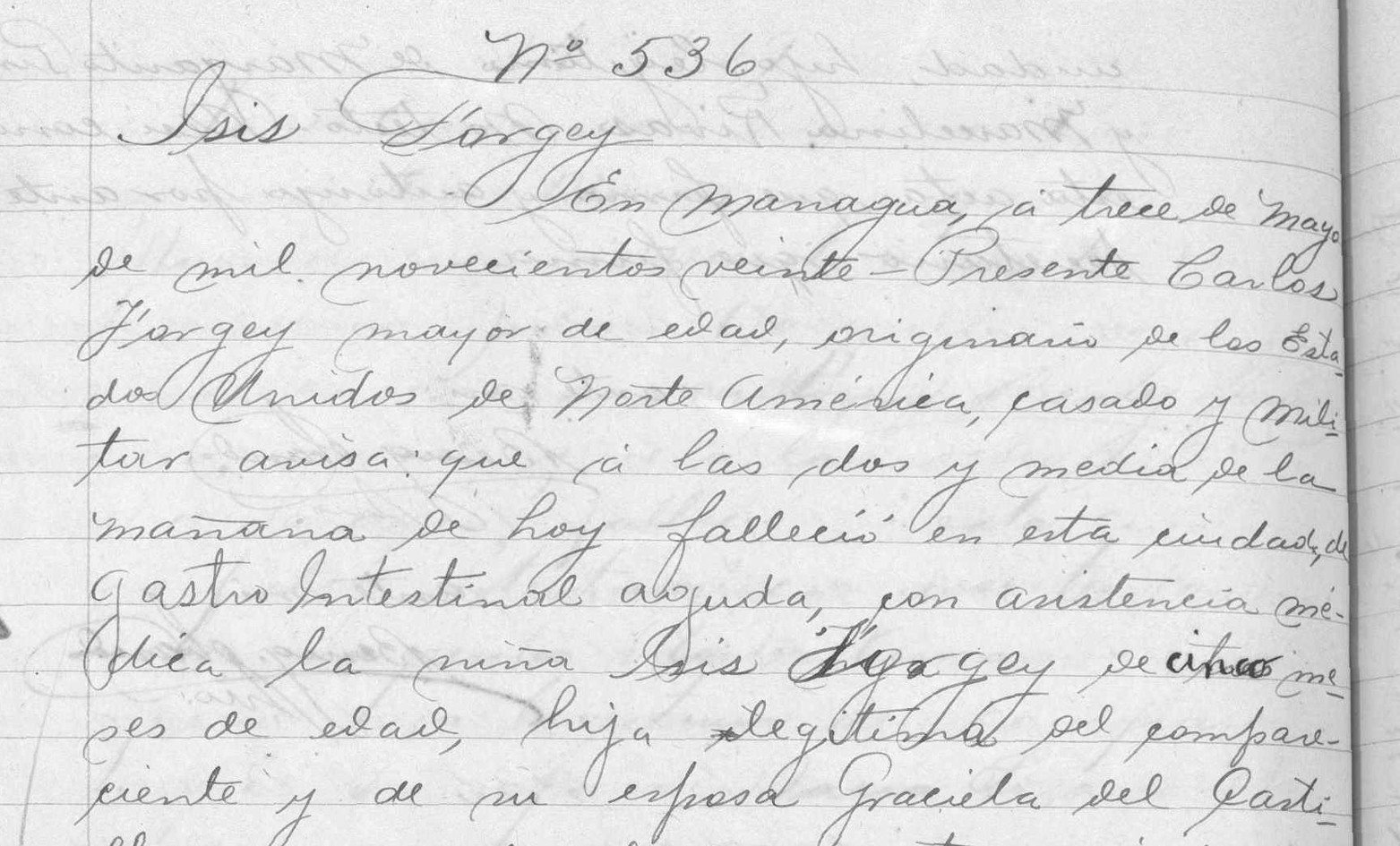My maternal grandparents Charles Forgey and Graciela del Castillo lost a daughter named after her paternal grandmother in Nicaragua. Their daughter Isis Forgey died as an infant of a gastro-intestinal disorder. My mother had thought she died of a broken neck. The family had a photo taken of her after she died and maybe her head slumped to one side?
